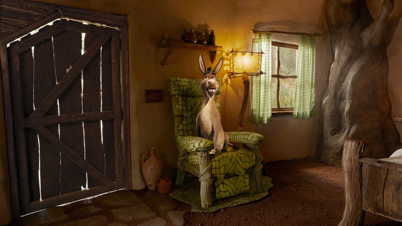 اتاق بیرونی نمادین شرک نیز در لیست املاک ذکر شده است.در تبلیغ نیز اعلام شده است که دوست صمیمی شرک، الاغ، که به عنوان نگهبان باتلاق شناخته شده، فرش خوش آمدگویی را برای مهمانان آماده کرده است.
